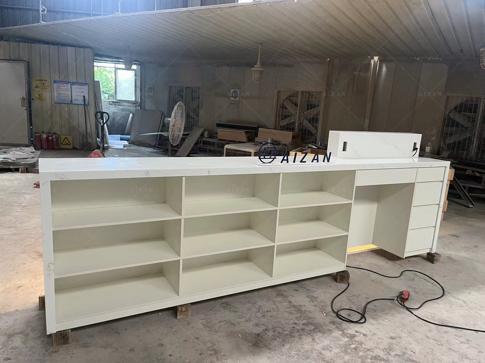 Material: 18mm plywood frame+12mm artificial stone finishing+ custom logo