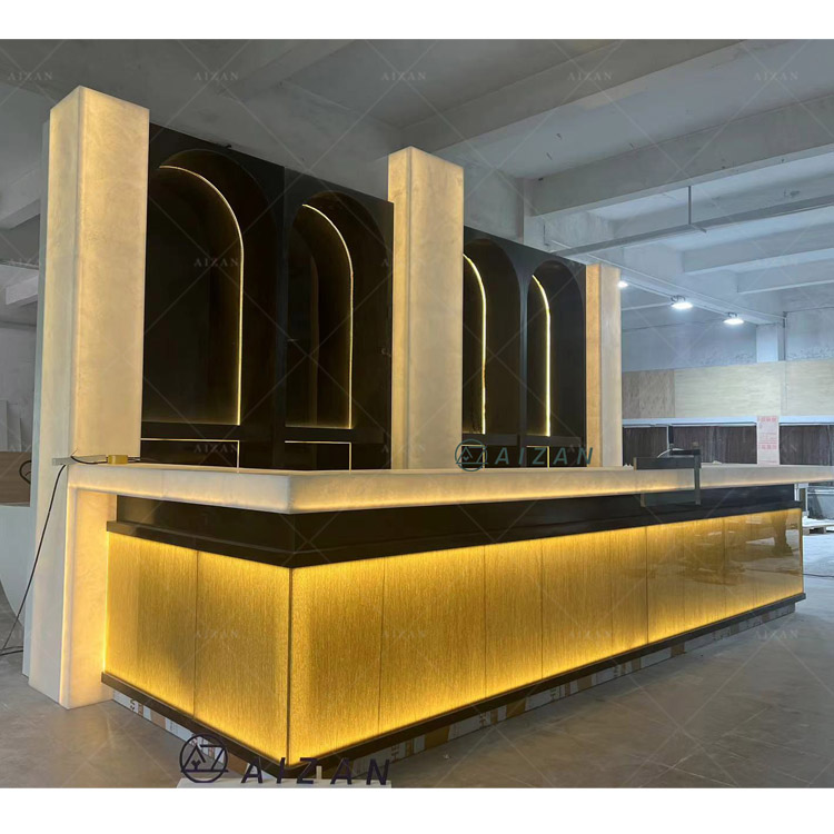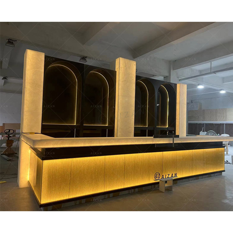 2. Material : 18mm plywood frame + 12mm Corian translucent marble stone countertop + tempered glass frontfor high quality wine bar counter